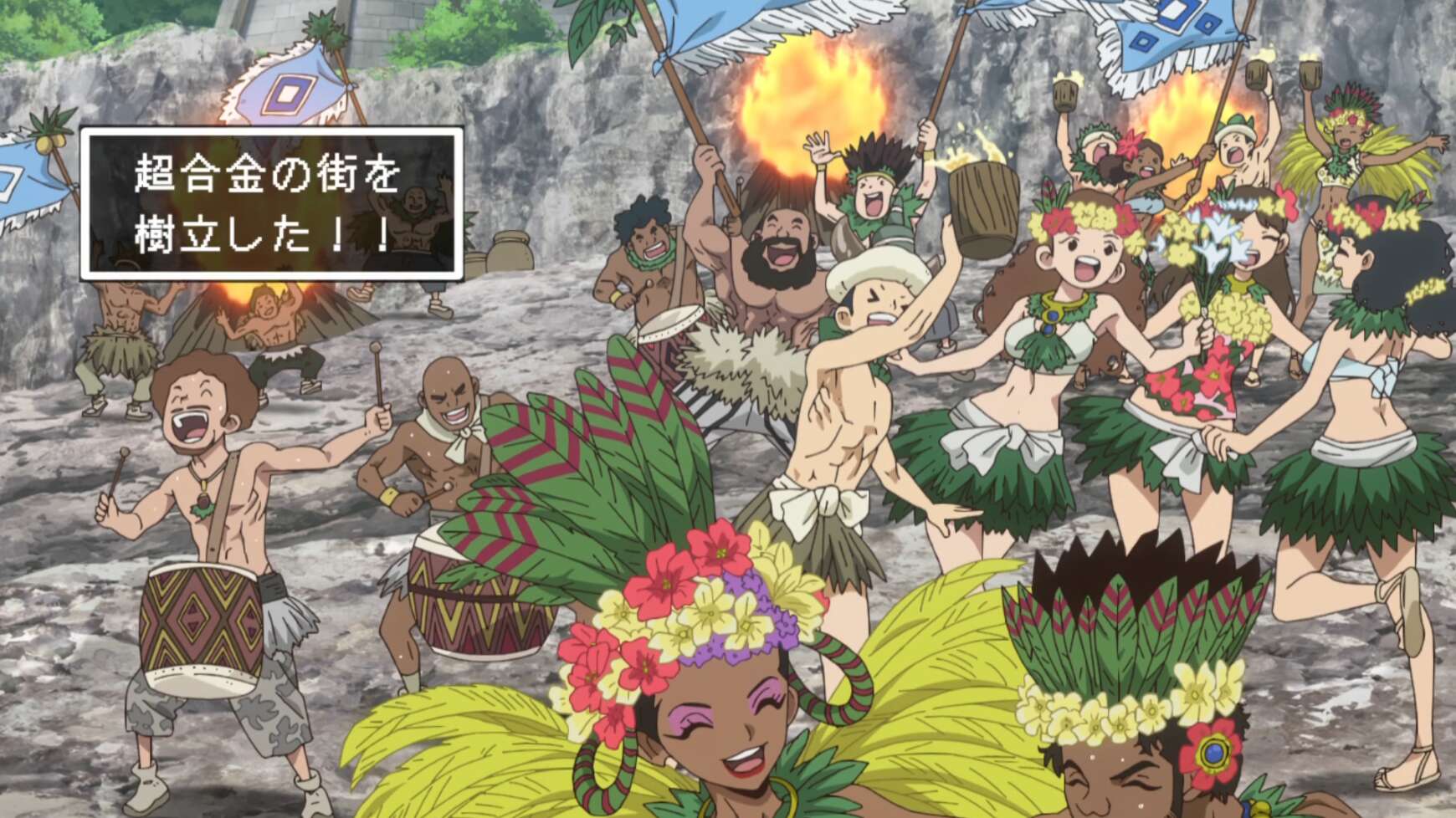 そして新たな仲間も石化から復活させて全員で力を合わせてレアメタルを採掘し、ついにアラシャに超合金の街を新たに立ち上げます。