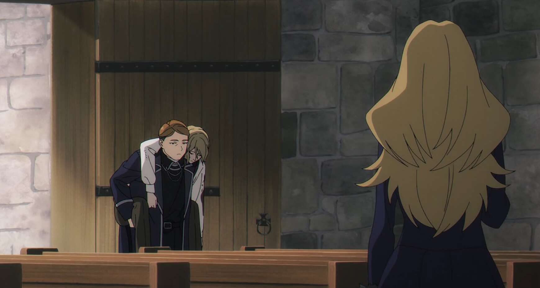 教会に犠牲者を集めて安置するゲナウとメトーデですが、ゲナウが使っていた鳥(め)が一つ潰されます。故郷を全滅させられて殺気立っていたゲナウは、鳥(め)を潰した魔法使いを攻撃しようとします。