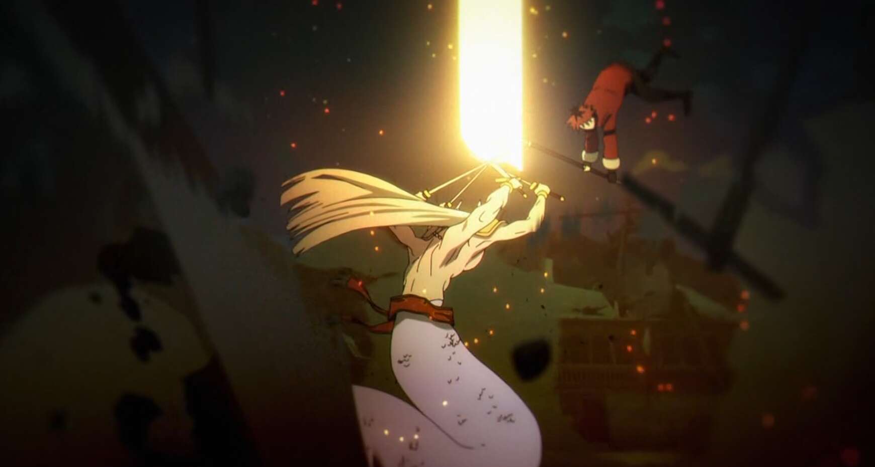 ゲナウは聞く耳を持たずレヴォルテに止めを刺そうとしますが、村には子供の生存者がいてレヴォルテはゲナウの隙をついて子供に剣を投げ殺そうとします。しかしゲナウはレヴォルテが剣を投げる前に子供に気付き、剣をディガドナハトで防ぎ子供を救います。