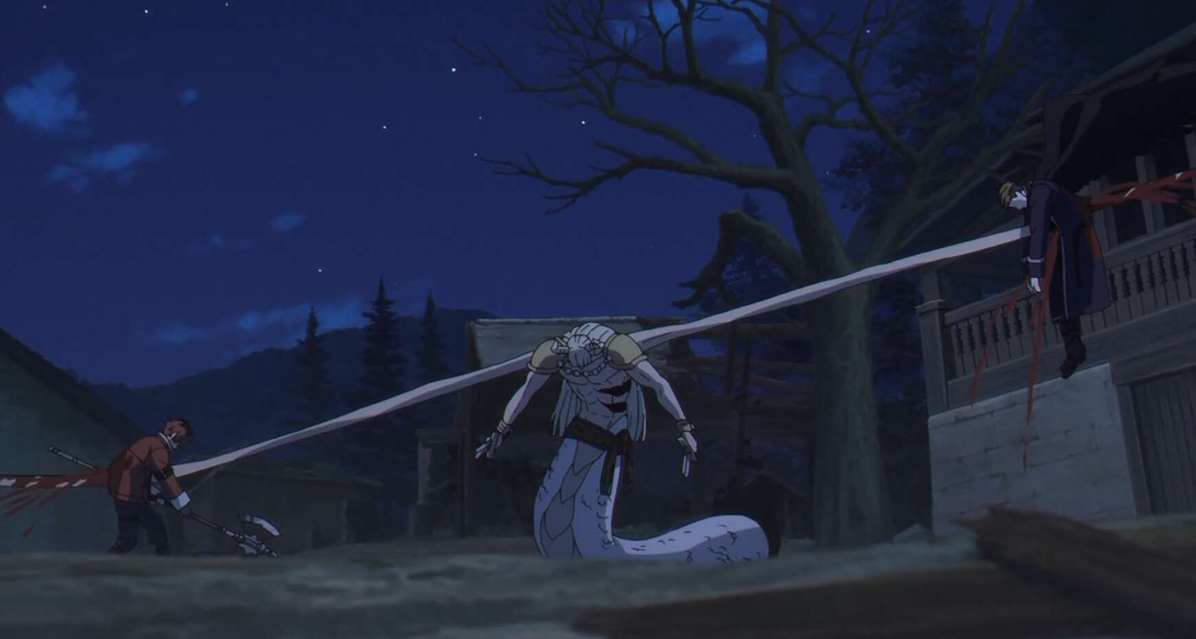 しかし村の生存者と思われた子供は罠で、レヴォルテの部下のユンが子供に化けた姿でした。完全にユンを人間の子供と思っていたゲナウは、ユンに小刀で刺されて倒れてしまいます。