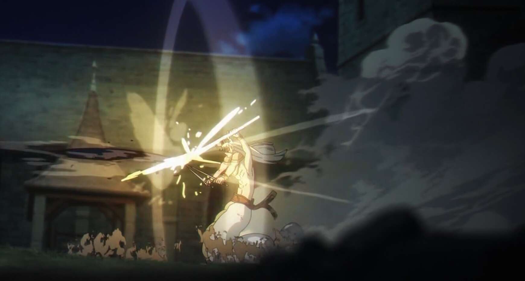 シュタルクと魔法・ディガドナハトを操るゲナウの二人がかりでレヴォルテを攻撃しますが、剣の手数も反射速度も体力も人間とは桁違いのレヴォルテ相手では二人がかりでも徐々に押され始めます。