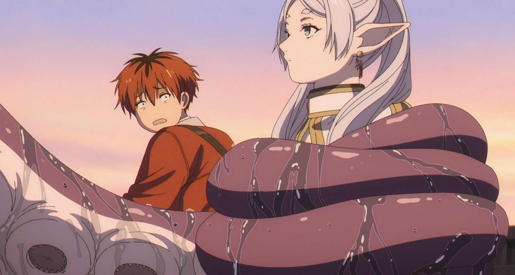 こうしてフリーレン一行はコリドーア湖を渡れることになりましたが、湖で海の魔物・クラーケンに遭遇し、フリーレンがクラーケンの触手に絡み取られて捕まってしまい、湖に引きずり込まれそうになります。