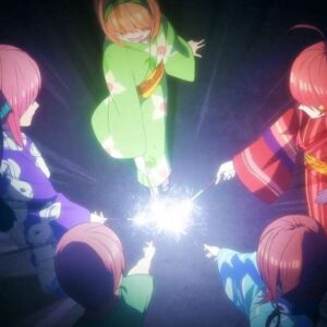 が、この後風太郎は高熱を出して倒れてしまいます。風太郎は部屋で絶対安静と言われしかたなく、一花たちはキャンプファイヤーに風太郎抜きで出ます。各々自分の本音を話しながら、キャンプファイヤーは進んでいきますが、場面は突如結婚式に代わります。