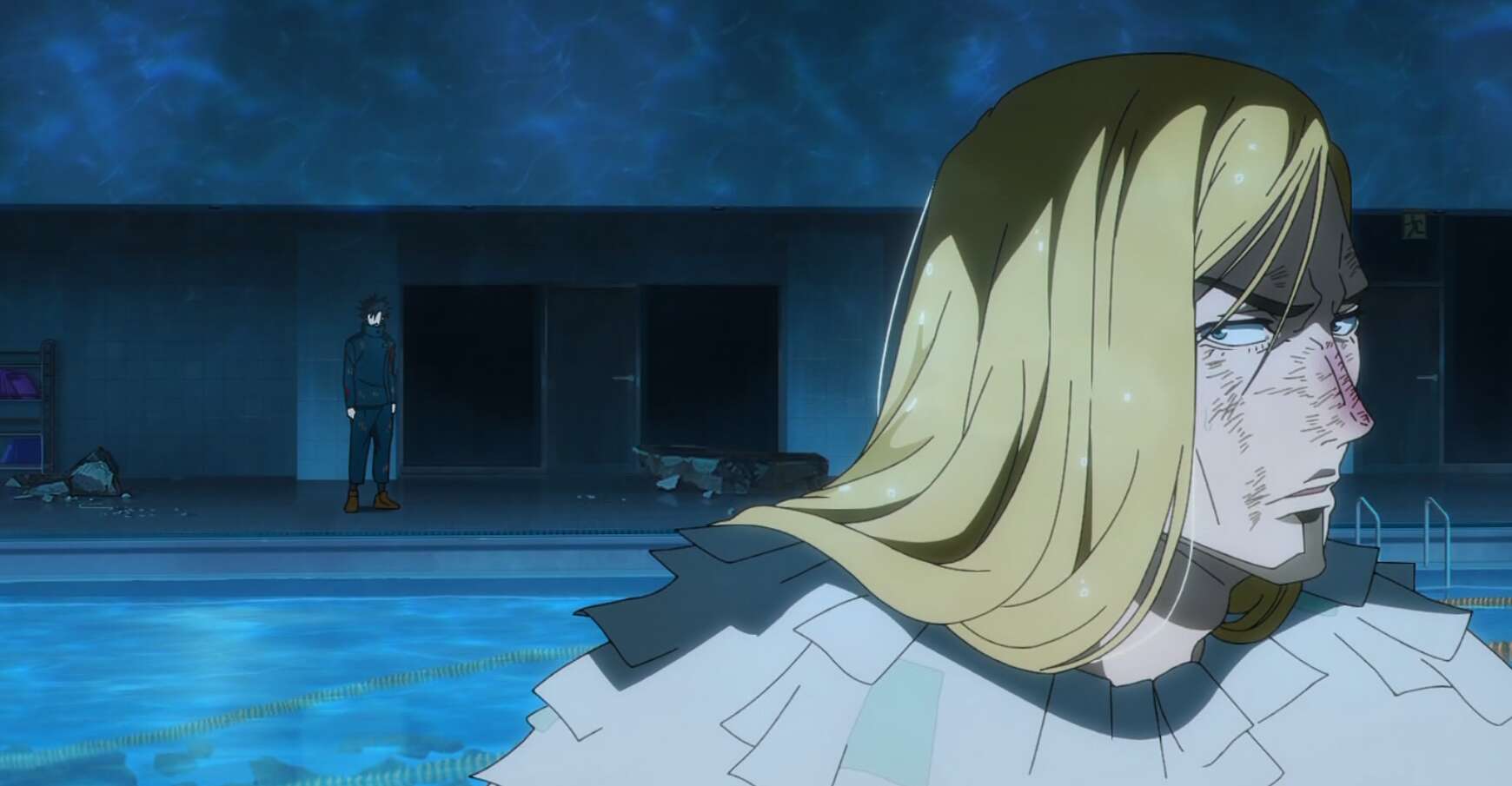 水から抜け出したレジィはやっと、自分が置かれた状況を理解します。体育館の下の地下1階、温水プールにレジィはいました。レジィがとっておきを再現した後、伏黒は影に逃げ込んでから領域を解き、再現した建物が床を破壊した後にレジィはプールに落ちていました。レシートがプールで濡れてしまったレジィは、「契約書を呪力で焼ききる」という条件が満たせず再契象が使えません。