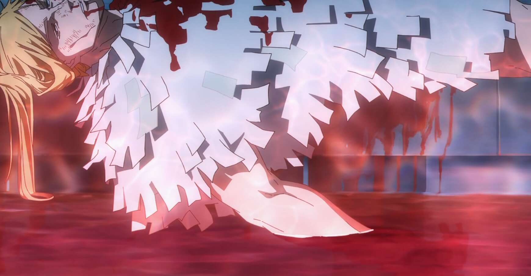 呪術師の騙し合いに負けたレジィは、玉犬の攻撃で体から大量に出血をします。呪術師は嘘ついてなんぼ…か、とレジィはつぶやくと、その場に倒れます。