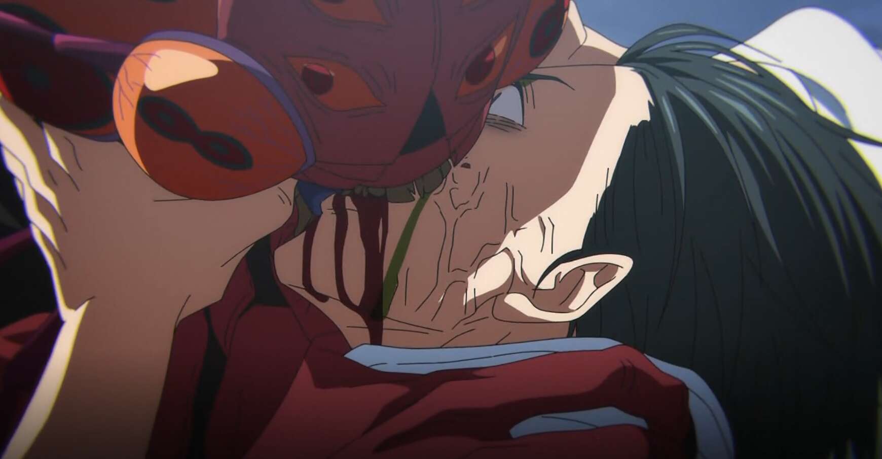 乙骨は再び呪力でゴキブリの群れを薙ぎ払いますが、2体の式神のような呪霊を斬ると呪霊から体液が出て乙骨は目が見えなくなります。そこに黒沐死が襲いかかり乙骨は爛生刀で斬られてしまい、爛生刀から飛び出した呪霊のようなものを肩にくらうと、乙骨の肩から呪霊が出てきます。肩と腹にダメージをくらった乙骨は、黒沐死に身体を掴まれて喰われそうになります。