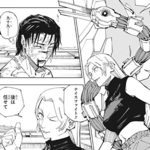 七海が合流し、虎杖と七海は共闘して真人を祓おうとします。一方、真人は改造人間のストックを出して虎杖と戦わせ二人を分断し、先に七海を殺そうとします。虎杖は化け物じみた姿になったとはいえ、元人間を殺せずに苦悩します。