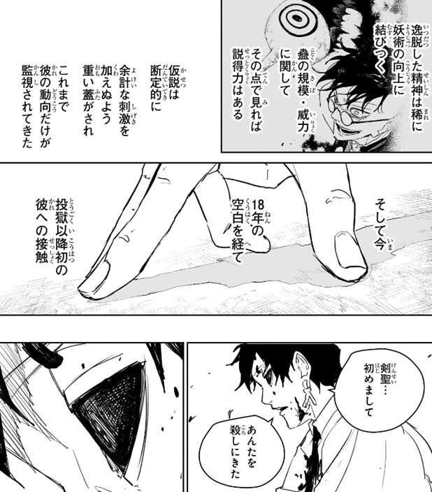 剣聖は“蠱”を起こし小国の生命20万を奪い、その後五人の妖刀契約者によって制圧され、この地下牢獄に収容されました。その間、精神鑑定などを執り行う猶予は無かったそうですが、当時の剣聖の状態について真打の強大な力に飲まれたことによって“彼は重度の錯乱状態にあった”と推測で語られているそうです。今の荻原のように逸脱した精神は稀に妖術の向上に結びつき、蠱の規模・威力に関してその点で見れば説得力があり、仮説は断定的に余計な刺激を加えぬよう重い蓋がされ、これまで剣聖は動向だけが監視されてきたようです。そして今、18年の空白を経て投獄以降初の接触を幽が行いました。幽は剣聖に、あんたを殺しにきたと正直に明かします。