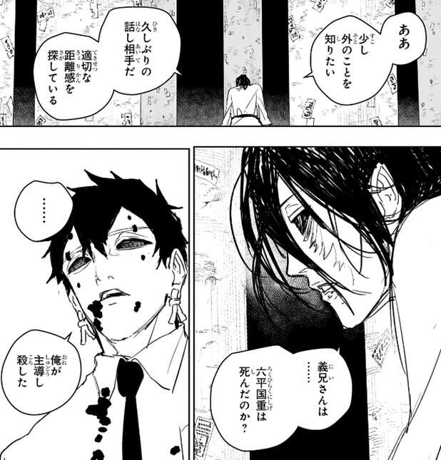 幽は剣聖が健全なままで“蠱”の威力を発揮した事に驚きますが、自分への身体への浸食をやめたのも“意思の下”にか?と剣聖に質問し、剣聖は少し外の事を知りたいと答えます。そして、義兄さんは…、六平国重は死んだのか?と、幽に質問、幽も自分が主導して殺したと答えます。ここで剣聖が国重の妻の弟だと明かされますが、剣聖は義理の兄が殺されたと分かっても驚かず、急に妖刀が動いたんでそうかと思ったよ、…それで今度は俺を殺しに来たのか、とつぶやきます。