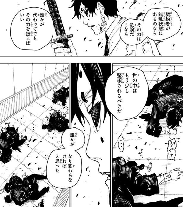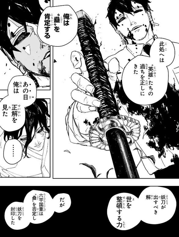 幽はそのつもりだったと言うと、俺は“蠱”を肯定する、あの日俺は正解を見た、と剣聖に言います。妖刀が出すべき解は世を整頓する力だが、六平国重は“蠱”を否定し妖刀を封印した、大きな間違いだ、と幽は言います。一方、身体から草花が生えた神奈備の妖術師ですが、一応意識はあり真打の力に耐えられたようです。