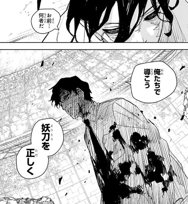 幽は剣聖に、俺とあんたは協調できる、と言い、剣聖は、お前…何者だ、と聞きますが、幽は質問には答えず、俺達で導こう妖刀を正しく、と言います。