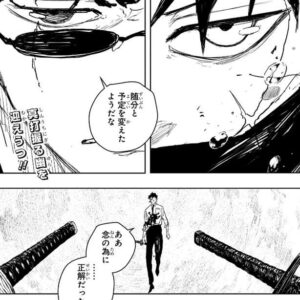 もう一人の受け皿の幸禎は逃走していて、まだ荻原達の近くにいるようですが、誰も追えずにいるようです。さらに荻原は幸禎の不死に近い力のタネを暴く猶予もなく、たとえ追いつけても殺すことができないと焦っていました。するとこのどうしようもない状況で、結界の要である妖術師は、…もう……あれしかない……俺を殺せ、と亥猿に頼みます。仮に結界の要である妖術師が命を断てば、結界は完全に幸禎に分け渡すことになり妖刀を阻む力は強固になってしまいますが、結界は安定するので電波は戻りこの事態を外に知らせる事ができます。自分が死ねばすぐに妖刀以外の増援を呼べる、自分が死ねばみんなを助けられる、と結界の要である妖術師は亥猿に言いますが、それは虚勢で内心は死にたくないと考えていました。