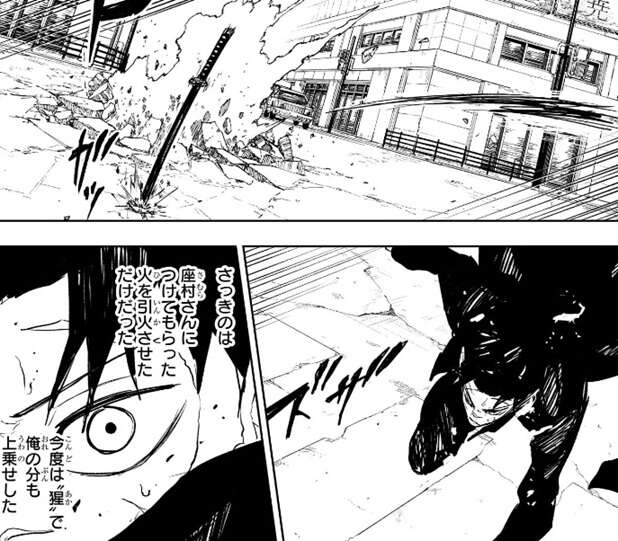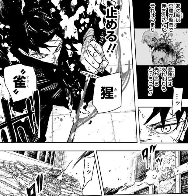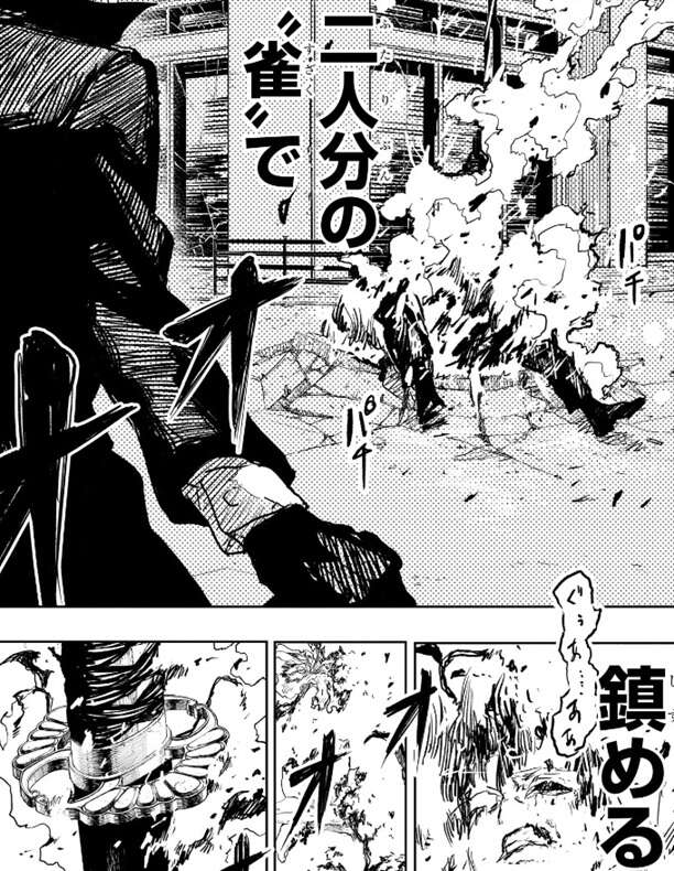 さらにチヒロは幽を斬った時に、雀の炎を幽に解き放ちます。上空にいた時は、座村につけてもらった雀の炎を幽に引火させただけでしたが、今“猩”で雀の炎を解き放ちチヒロの分も上乗せした事で、二人分の“雀”が幽を焼いています。
