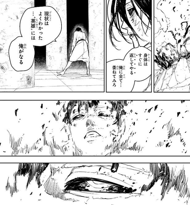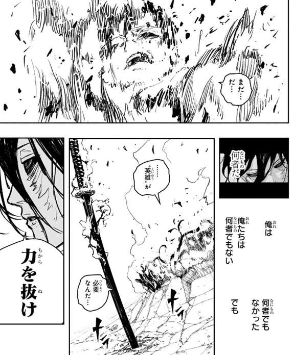 二人分の雀の炎に焼かれる幽を複雑な表情で見つめるチヒロに対して、幽は、まだ…だ…、と言い抵抗しようとします。自分たちは何者でもなかった、と幽は自分に問いかけつつ、でも“英雄”が必要だとつぶやきます。それに応えるように剣聖が幽に、力を抜けと語りかけます。