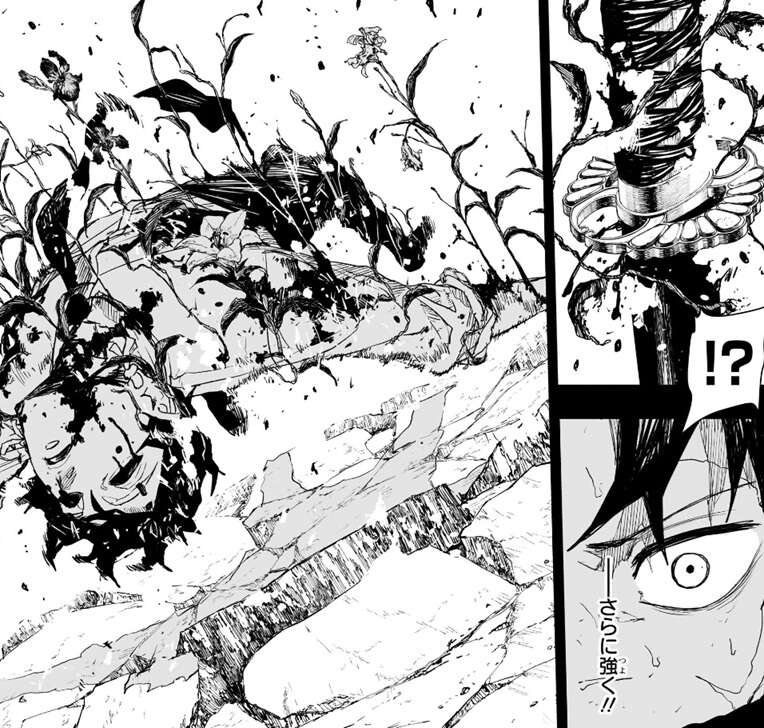 真打の侵蝕がさらに強まり、幽の身体から草花がいくつも生えてきます。さらに真打が鞘から抜けて、刃が見えます。