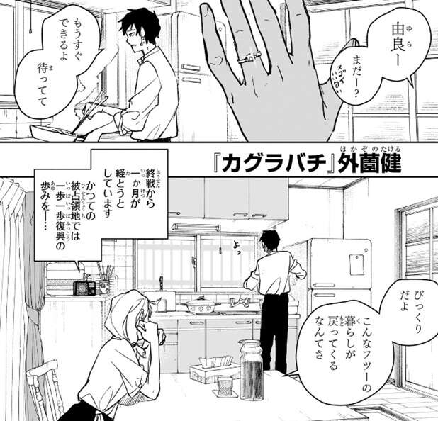 斉廷戦争が終結してから一か月後くらいの場面が描かれていて、幽がフライパンで料理を作っています。幽は女性と会話していますが、女性の薬指に結婚指輪らしきものがあるので、幽の妻と思われますが、幽のことを“由良”と呼んでいます。ラジオからは、かつての非占領地では一歩一歩復興の歩みを…、といったアナウンサーの音声が流れていて、今後の安寧を願い六平国重による刀剣の奉納が行われた、といった事もラジオが知らせています。状況から幽と妻と思われる女性は非占領地の人間のようで、びっくりだよ、こんなフツーの暮らしが戻ってくるなんてさ、“英雄”たちに感謝だね、と普通の暮らしができる事が英雄たちのおかげだと英雄を好意的に捉えています。