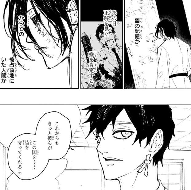 第104話では、幽の過去の一部が明らかになり、幽には妻がいて実は既婚者の可能性が高い事が判明します。さらにその妻と思われる女性は幽の事を、“由良”と呼んでいるので“由良”という方が本名の可能性が高いです。そして幽は非占領地の人間とあるので、小国の侵攻を受けた地域にいた人間という事になるのでしょうか?しかし、その妻と思わる女性も途中の描写から戦後死亡してしまったと推測され、幽が真打にこだわるのも、真打で戦後に世の中を整頓できていれば妻は死ななかったと考えているのかもしれません。
