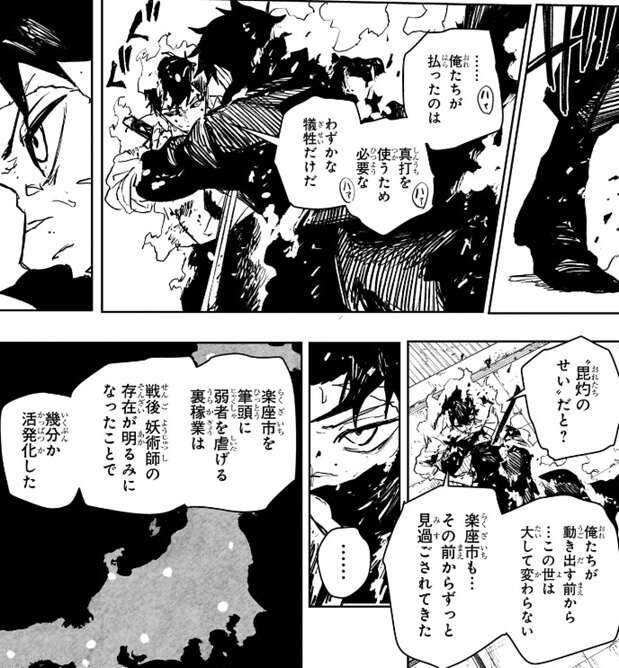 しかしチヒロの言葉“毘灼(お前ら)のせいだ”という言葉を聞いた幽は、俺達が払ったのは真打を使うため必要なわずかな犠牲だけだ、“毘灼(おれたち)のせい”だと?俺達が動き出す前から…この世は大して変わらない、とチヒロに反論し、楽座市を筆頭に弱者を虐げる裏家業はずっと存在していて、戦後 妖術師の存在が明るみになった事で幾分か活発化した、弱者は各地で虐げ続けられてきた、神奈備ではその全ては手に負えなかったからだ、とチヒロに言います。