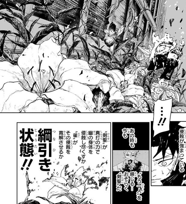 蜈によって向かいのビルに吹っ飛ばされたチヒロですが、雀の炎のおかげなのかあまりダメージはありませんでした。一方の幽は真打の侵蝕がさらに強まり、かなり苦しんでいます。チヒロはもう一人の存在、“剣聖”を感じていて、“剣聖”が真打の力で幽の身体を侵蝕し尽くすか、“雀”がその侵蝕を寛解させるか、綱引き状態と考えます。