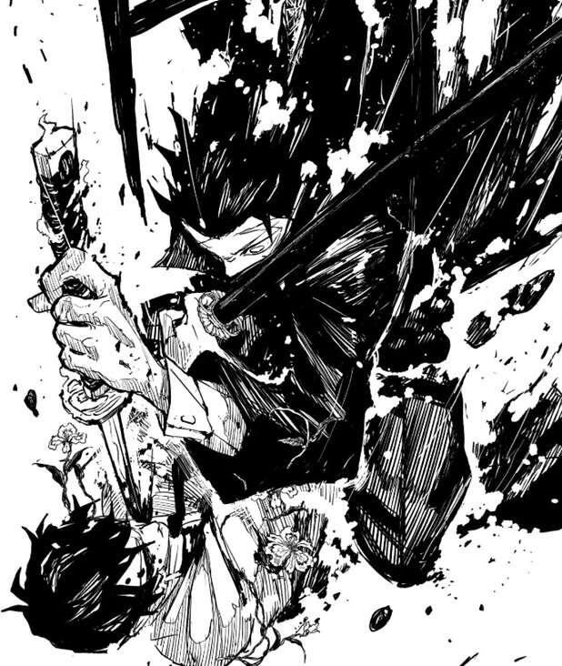 この幽の記憶は剣聖も見ていて、幽がかつての非占領地にいた人間だと知ります。そして幽も妻と思われる女性に同意する形で、これからもきっと彼ら(英雄)がこの国の皆を守ってくれるよ、と言いこの頃の幽は英雄に期待していたようです。場面は現在に戻り、チヒロと幽は雀の炎に包まれています。ここで、真打には命滅契約を凌駕する“異質”があり、真打だけは命滅契約を結んでいない他者でも力の一端を使うことができますが、その代償として使用者は身体を蝕まれる、と説明が入ります。