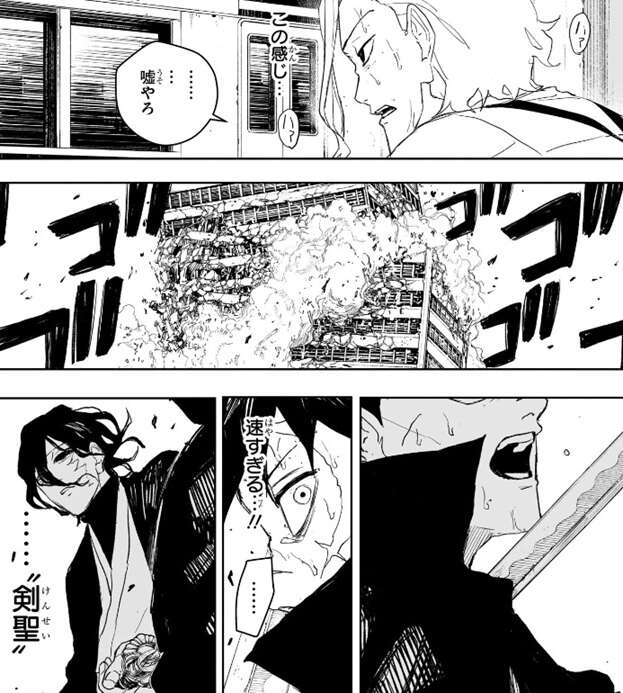 一方、市民を避難させている柴ですが、市民の数が多いようでさすがに息が上がっています。そして、柴は剣聖の気配を感じ、………嘘やろ、とつぶやきます。