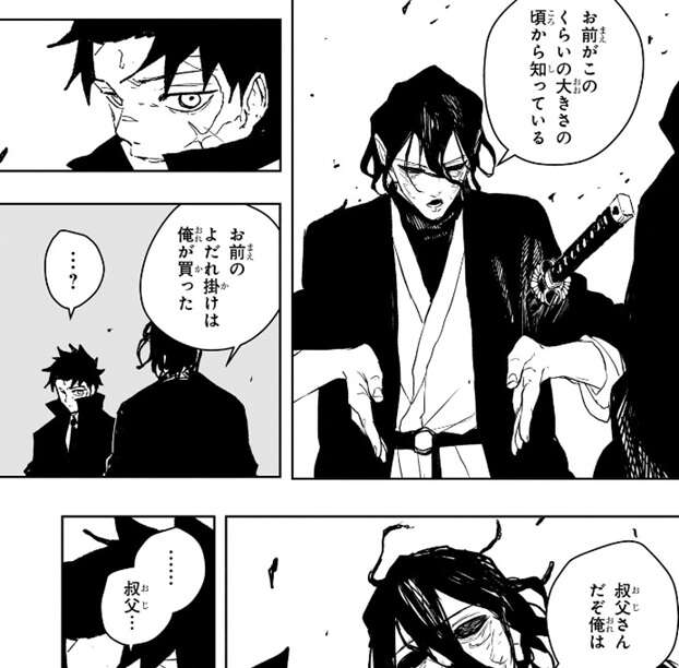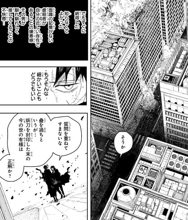 第106話では、剣聖がチヒロのお母さんの弟である事が確定し、さらに剣聖は地下牢獄に収容されている間も真打の付近を知覚していたことが判明します。それで国重やチヒロの事をずっと知っていたようで、チヒロのよだれ掛けを買ったのも自分だとチヒロに言います。馴れ馴れしい剣聖にチヒロは嫌悪感を抱きますが、その後剣聖は悪を滅し弱者を救わなければならないという妖刀の使命を全うすると言います。そして、漣家のハクリや漣家の一族を根絶やしにすると言い、障壁となる者も無論殺すと言います。