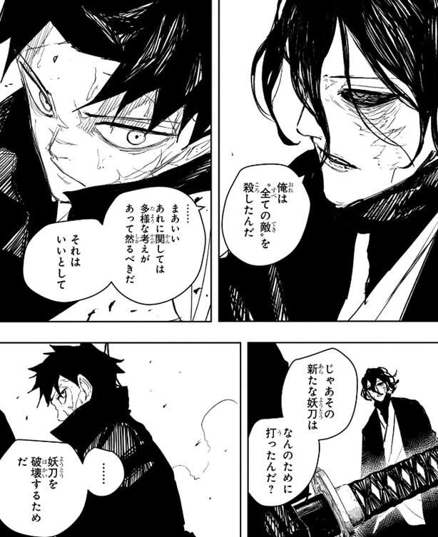 そして、チヒロになぜお父さんは妖刀を封印したかを聞き、チヒロは蠱という過ちを犯したから、と答えます。蠱が和平後の虐殺、それに子供を巻き込んだとチヒロは言いますが、…“義兄さんの教え”か…、と剣聖はつぶやきます。剣聖は小国の子供達は侵略者と同じ血が流れ、同じ教育を受けていた、だから俺は“全ての敵”を殺したんだ、とチヒロに言います。しかし、あれに関しては多様な考えがあって然るべきだと剣聖は言い、それはいいとして淵天を見てなんのために打ったんだ?と、剣聖はさらに質問するとチヒロは、……妖刀を破壊するためだ、と答えます。