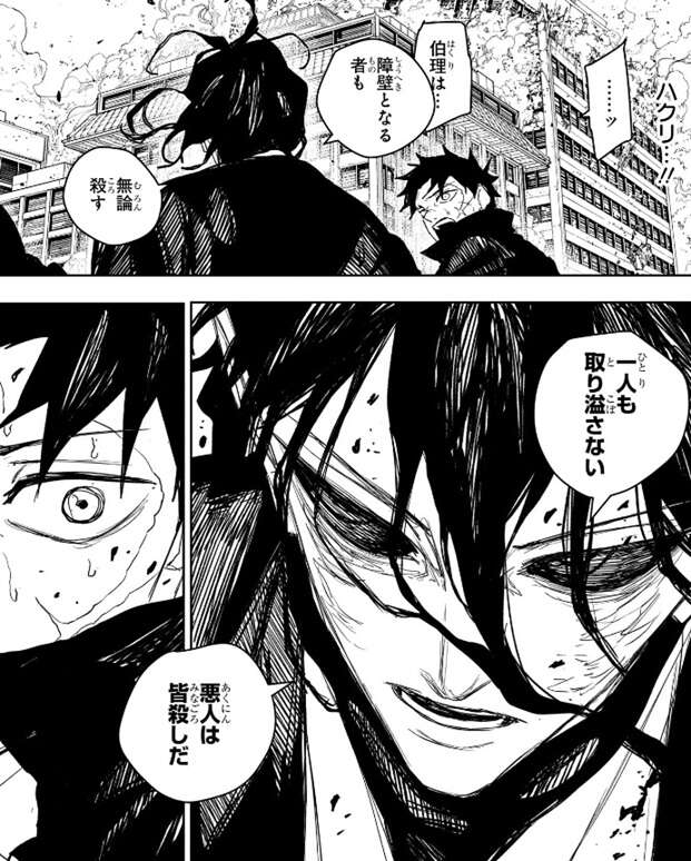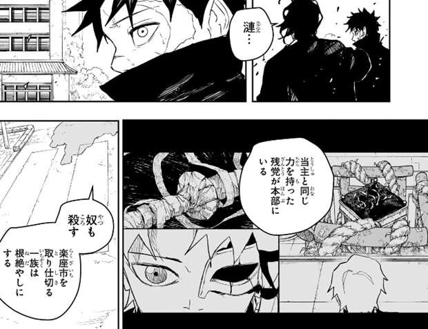 俺は使命を全うする、と剣聖は言うと、漣…、当主と同じ力を持った残党が本部にいる、奴も殺す、楽座市を取り仕切る一族は根絶やしにする、とハクリを殺すと言い出します。