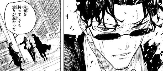 そこに蝶でビルごと両断された座村が戻ってきます。雀で傷を治したようですが、蝶で両断された傷は深かったようで、雀を持ってしても治りが遅かったようです。