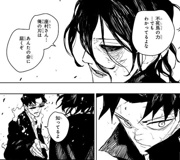 不死鳥の力でも剣聖の刃は座村の命に届くようで、剣聖は座村に警告しますが、座村も引こうとしません。二人は再び刀を抜いて剣聖に挑みます。