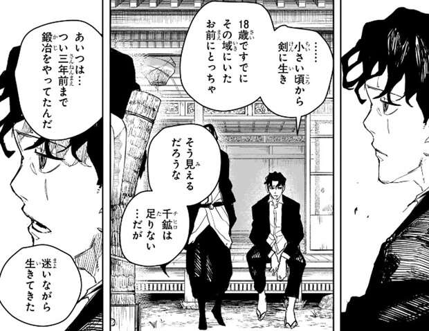 その言葉を聞いた座村は、小さい頃から剣に生き、18歳ですでにその域にいたお前にとっちゃそう見えるだろうな、と言い、千紘が足りない事を認めます。しかし、千紘はつい三年前まで鍛冶をやっていて、迷いながら生きてきた事を剣聖に告げると、…何もかもこれからなんだよ、と座村は言い飛宗を柄に納めます。それを見た剣聖も、同様に勾罪を柄に収めようとします。