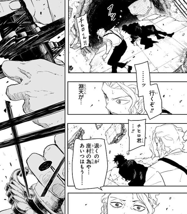 黒い雀の炎がチヒロの心臓の傷などを再生しますが、雀の黒い炎の力に刳雲が死に際に見せた限界を超えた力をチヒロは感じます。飛宗はまだ健在なので、捧げているのは座村自身の命だとチヒロは直感します。離れた場所にいるイヲリが映りますが、座村が命を捧げて限界を超えた力を使おうとしているのを何か感じているのかもしれません。