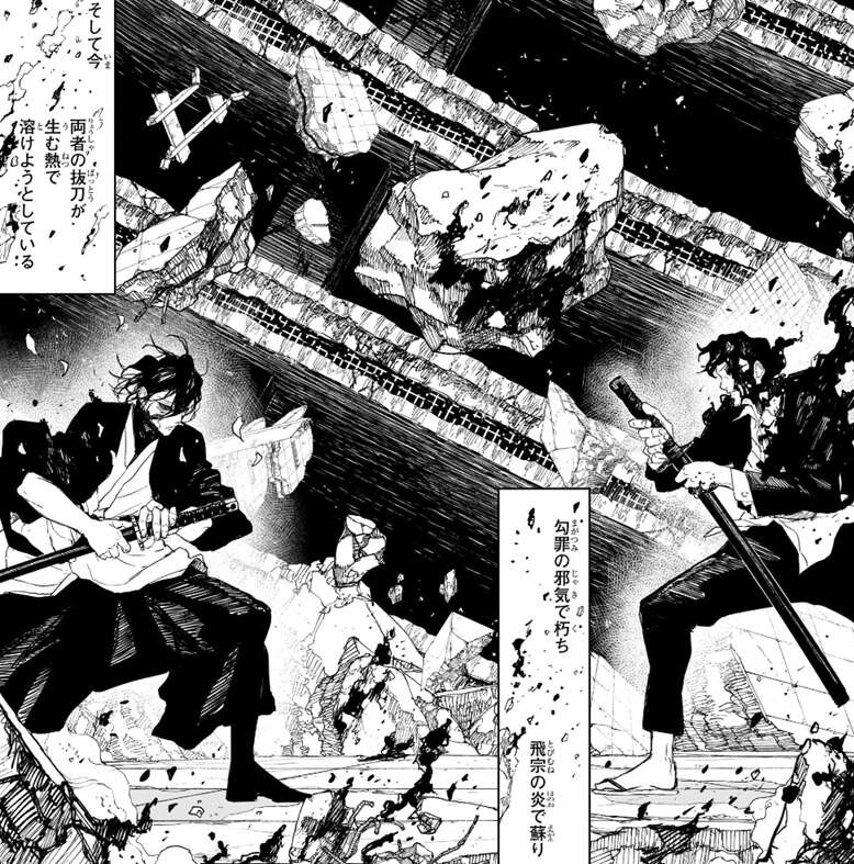 両者が納刀した衝撃で地を発った瓦礫が、勾罪の邪気で朽ち、飛宗の炎で蘇り、さらに両者の抜刀で生む熱で溶けようとしていました。