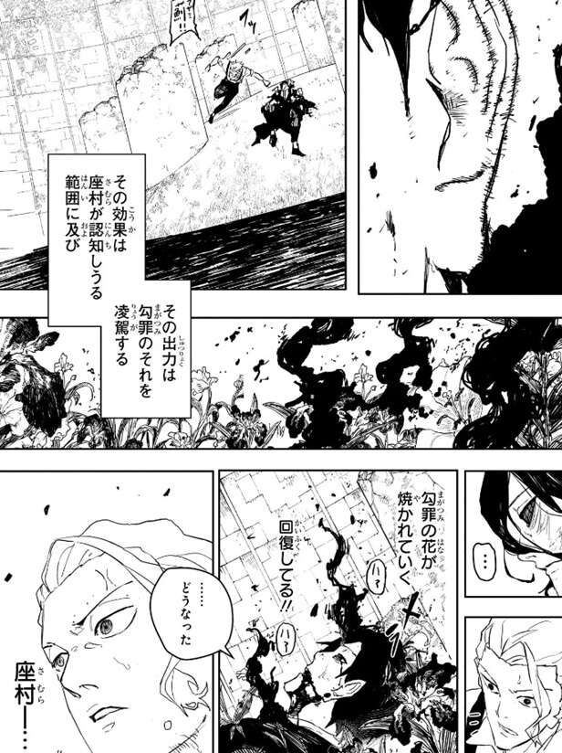座村の黒炎の効果は座村が認知しうる範囲に及び、その出力は勾罪のそれを凌駕していました。一方、柴が薊の元に瞬間移動で飛ぶと、薊の身体から生えていた勾罪の花が黒炎で焼かれていき、さらに傷も回復していて、どうなった?と、薊が柴に話しかけられるぐらいまでは傷は回復していました。