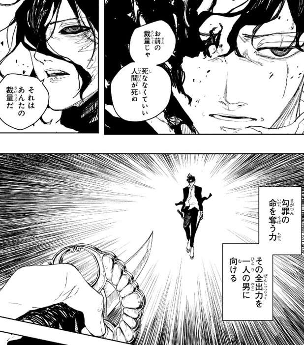 座村は剣聖に、お前の裁量じゃ死ななくていい人間が死ぬ、と言いますが、それはあんたの裁量だ、と剣聖は答えると、勾罪の命を奪う力、その全出力を座村一人に向けます。全出力が座村一人に向いたことで、神奈備本部の味方に向けられていた勾罪の力が弱まり致命傷を免れます。神奈備本部にいる味方の救助を柴に任せると、座村は黒炎の全出力を自らに充てた後、瀕死に追い込んで牢獄に帰してやる、と剣聖に明言します。