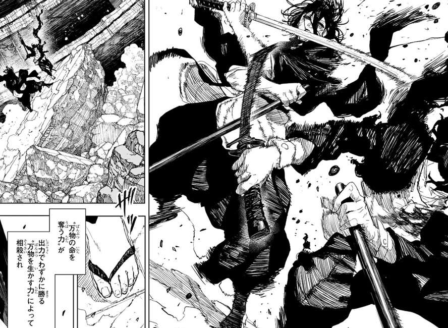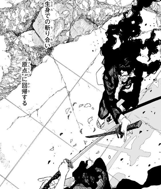 座村は剣聖に斬りかかりますが、勾罪の“万物の命を奪う力”が、出力でわずかに勝る飛宗の“万物を生かす力”によって相殺され、二人の剣士の妖刀の能力は斬り合いに影響を与えなくなります。