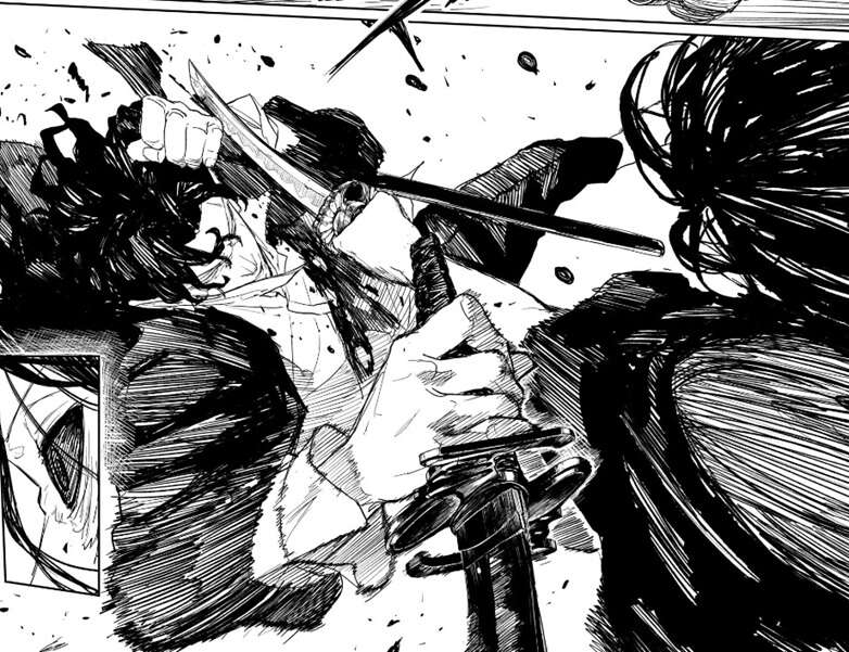 チヒロが「勾罪」を、曽我明無良を次で斬るために、二人の様子に注目していた次の瞬間、座村と曽我明無良は抜刀し、居合でお互いを斬ろうとします。