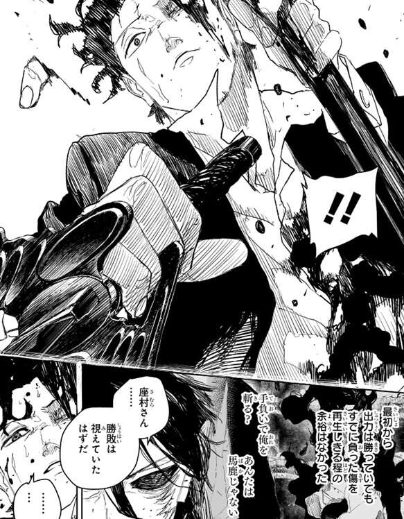 剣聖は座村の横薙ぎの斬撃をかわすと下段から座村を斬り上げて、座村は指の一部と左目付近を斬られてしまいます。座村は出力では勝っていても既に負っていた傷を再生しきる程の余裕はなかったようで、剣聖は、座村さん……勝敗は視えていたはずだ、と座村に言います。