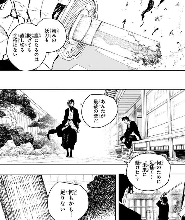 さらに、頼みの妖刀も塵になるのは防げても直し切る余裕はない、あんたが最後の砦だ、と剣聖は座村に言うと、座村がチヒロに何を期待するのか分からないようで、何もかも…足りない、と剣聖は続けて座村に言います。