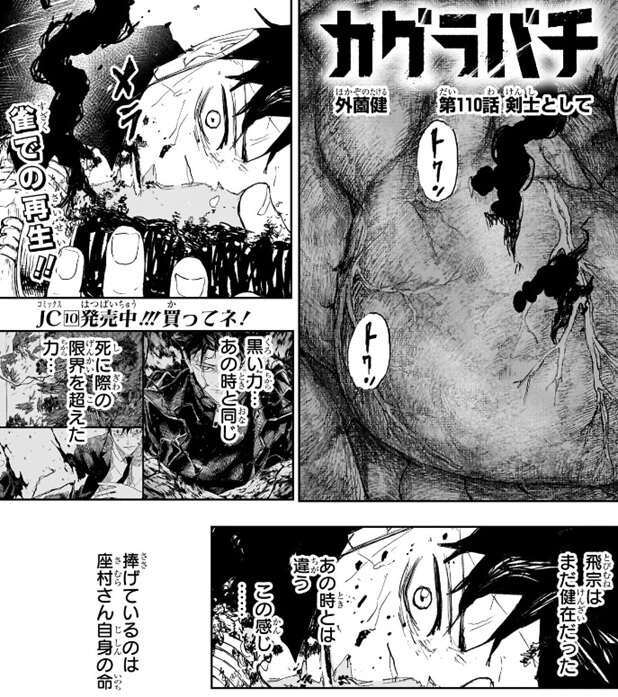 第110話では、剣聖が勾罪の力の全出力を座村に向けますが、そのおかげで神奈備本部で死にかけていた薊や漆羽、奈ツ基や上層部隊の隊員達は致命傷を免れ、死なずにすみます。また、座村も黒炎の全出力を自分に充てる事で、雀の炎の力が勾罪の命を奪う力にわずかに勝り、二人の勝負は生身での斬り合いに移ります。しかし、剣術の腕も剣聖の方が上のようで、座村は徐々に追い込まれていきますが、座村は剣を納刀しそれを見た剣聖も剣を納刀、二人の剣士は抜刀による居合で勝負を決めようとします。