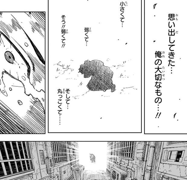 そして、自分の大切なもの、小さくて…、弱くて…、そして…丸っこくて……、と自分の大切なものを少し思い出します。次の瞬間、宗也は何かを見つけると、それに向かって全速力で走っていきます。