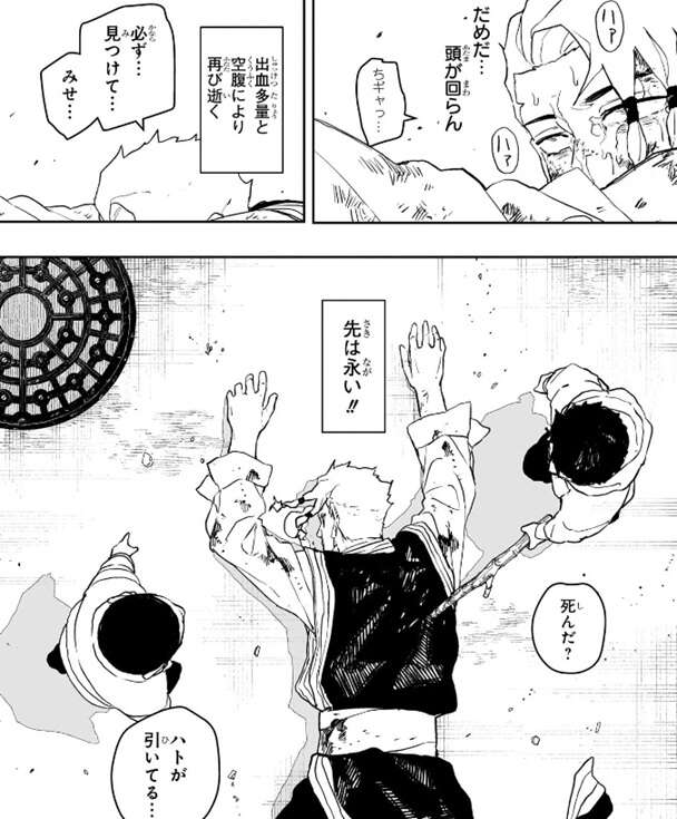 宗也はこれ以上頭が回らず、さらに出血多量と空腹で再び逝きます。逝く間際、宗也は必ず見つけて見せると言いかけますが、先は永そうです。子供にイジられる宗也ですが、いつかハクリにたどり着けるでしょうか?
