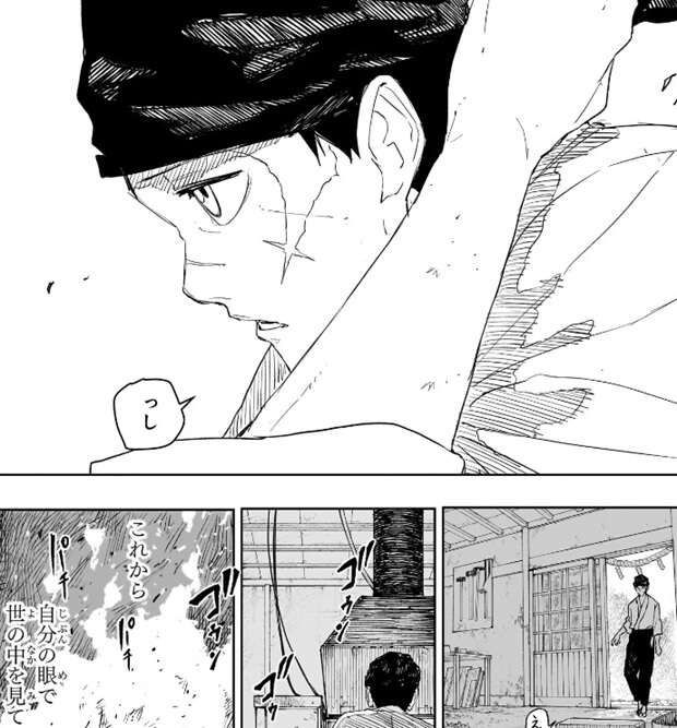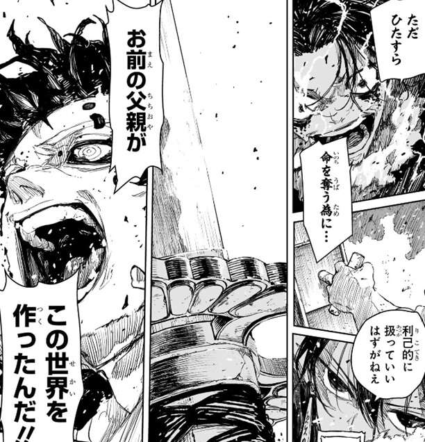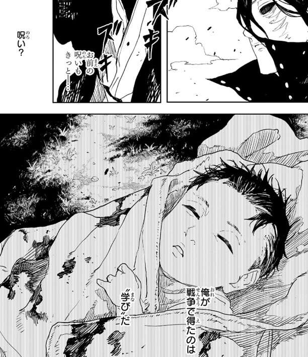 一方、剣聖は座村が最後に残した、お前の呪いもきっと…、という言葉を思い出すと、座村に斬られた胸の傷が痛みだします。そして剣聖は、呪い?俺が戦争で得たのは“学び”だ、と自分自身に言い聞かせます。この時、俺が戦争で得たのは“学び”だ、という剣聖のセリフのバックには、赤ん坊が描かれていますが、これは誰の赤ちゃんの頃のものでしょうか?チヒロでしょうか?それとも、剣聖?
