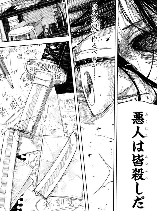 そして剣聖の、悪人は皆殺しだ、という言葉も思い出しながら、何の為にどんな刀を作るべきか、とチヒロは考えます。さらに机の上には折れた淵天や折れた刳雲?の他に、チヒロが書いたと思われるメモがありますが、新・淵天という文字や新・刳雲といった文字がありました。新しい淵天や刳雲を作るつもりでしょうか?