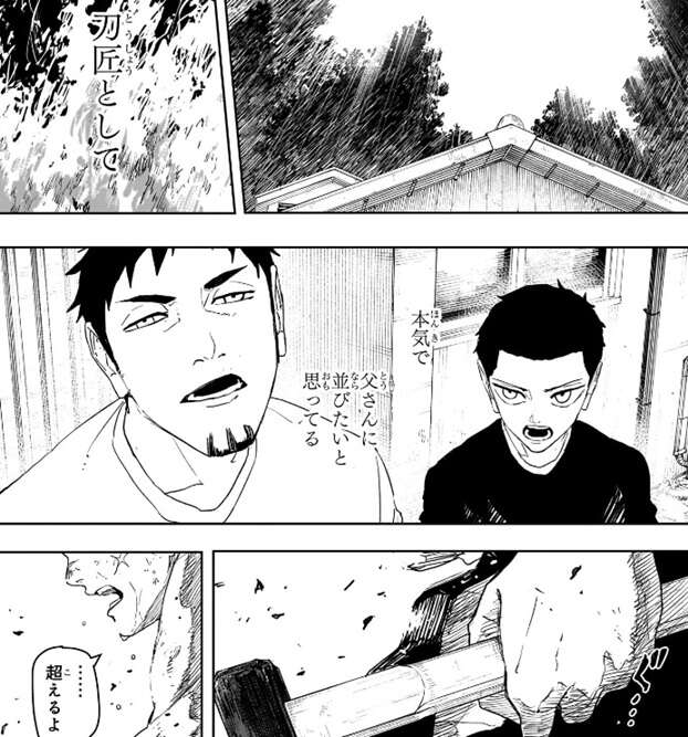 さらにチヒロは第一話で、刀匠として本気で父さんに並びたいと思っている、と父親に言った昔の言葉を思い出し、(刀匠として父さんを)……超えるよ、とつぶやきます。