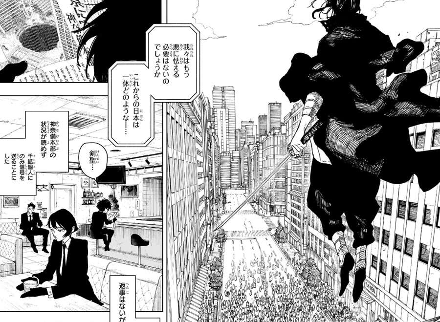 第112話では、剣聖に敗けた後、巻墨が折れた淵天や飛宗を回収、イヲリも保護していました。剣聖は日本中に対して悪人に宣戦布告を行ったようで、日本の新聞やラジオは英雄・剣聖が生きていた事や宣戦布告を大々的に報道していました。