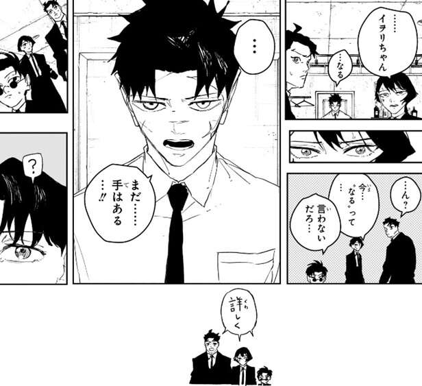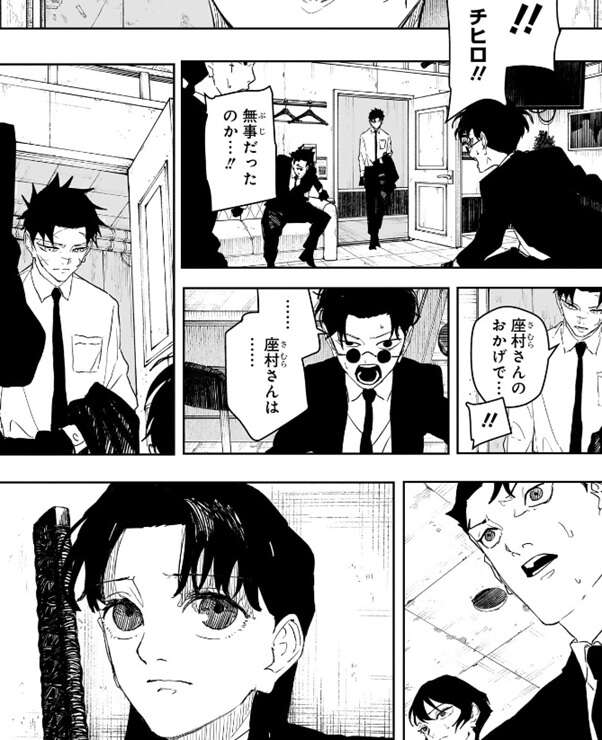 イヲリは巻墨が回収した飛宗を大切そうに抱えていました。その時、扉が開いてチヒロが入ってきます。巻墨が座村の行方を聞きますが、チヒロは何も答えず全員が座村が無事でないと察します。