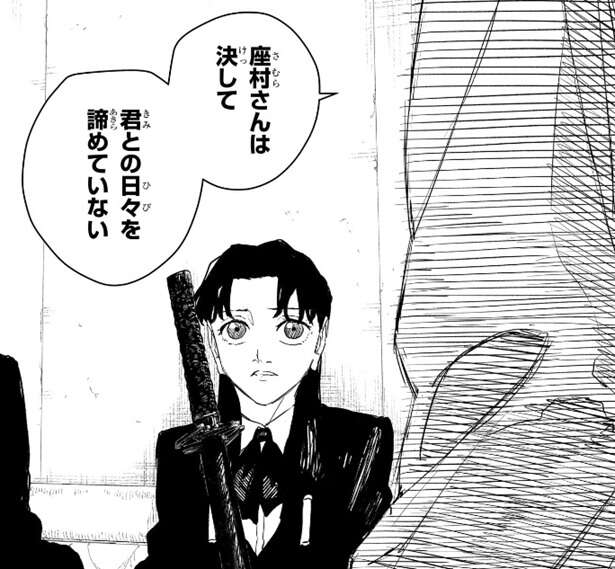 確証もなく希望的観測だが、根拠はある、とチヒロは言い、さらに座村は決して君との日々を諦めていない、とイヲリに告げます。しかし、郎は“命を犠牲にする力”なら同じ力を使うには生贄ってのが要るんじゃ、と誰か犠牲になる必要があるのではとチヒロに聞きますが、チヒロは妖刀が自らの身を犠牲にして黒い力を発揮した刳雲の時の事を話します。