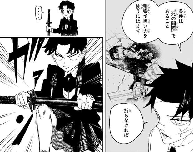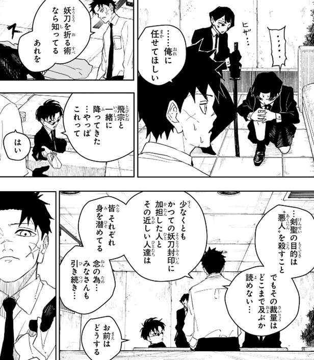 妖刀にも…命の様な概念が在る…のだと思う、とチヒロが言うと、郎はこの飛宗自体を犠牲にすれば、また黒い力が使えると言い、杢も早速やろうぜと言います。しかし、チヒロは今は無理だと言い、“死の間際”である事が条件で、飛宗で黒い力を使うにはまず飛宗を折らなければいけない、とチヒロが言います。それを聞いたイヲリは飛宗を自分の膝で折ろうとする無茶をします。