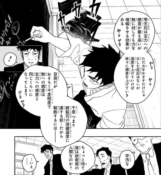 雫天石の熱に対する力の増幅や、徐々に温度を上げていけば感度も上がり千度程度で熱への感度は玄力への感度と同等になる事、鉄鉱石の溶融温度に達する前での製鉄する方法や可能性などを、国重は黒板にチョークで書きながら説明します。。学者は国重が妖術局の人間か聞き蓮見は否定しますが、なぜ我々の研究成果を知っているのか、部外者に話したのか?を気にします。